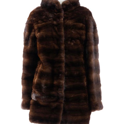 Kopenhagen Fur pelsjakke til dame i str. 40. Jakken er i brun pels med glat, mørk foring. Klassisk krave og gennemgående lukning foran. Modellen har let A-facon med ekstra vidde og detaljer forneden på ryggen. Velegnet som overtøj i den køligere sæson.