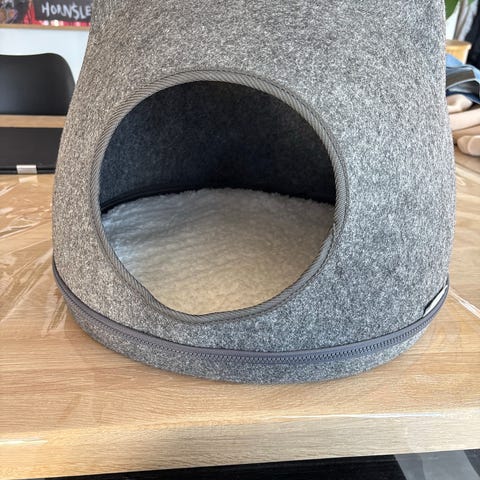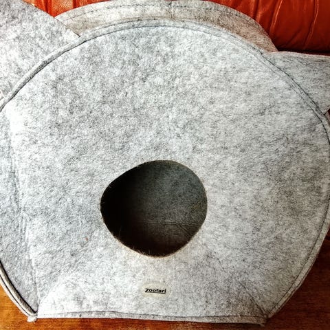 Zoofari kattehule i grå filt. Hulen er formet som et lille hus med katteører og rund indgang foran. Indvendigt er der en lys, blød pude, som kan tages ud. Velegnet som sove- og gemmested til kat eller lille hund. Materiale: filtlignende tekstil udvendigt og blødt stof i puden. Farve: grå udvendigt, lys indvendig pude.