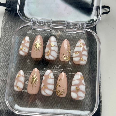 Kunstige negle i hvid plast. Leveres i opbevaringsboks med flere rum, hvor tipperne er sorteret i forskellige størrelser markeret med tal. Egnet til påsætning ved brug af neglelim og efterfølgende lakering eller dekoration.