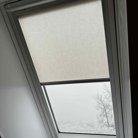 Velux rullegardin til ovenlysvindue i to farver, 2 mørkerød og 1 sort. Gardinerne er tilpasset montering i skrå ovenlysvinduer og er udført i et tæt stof, der dækker vinduet næsten helt. De kører i faste skinner i siderne og betjenes manuelt ved at trække i underlisten. Velegnet til rum med ovenlysvinduer, hvor der ønskes afskærmning for lys. 100 kr stk