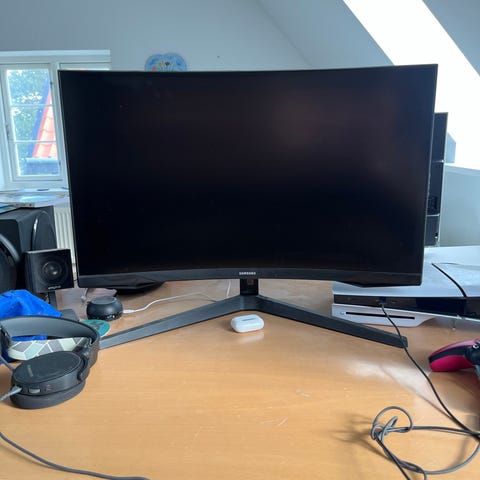 Samsung LC27F591F curved skærm på 27". Skærmen har buet panel, som giver et mere omsluttende billede end en flad skærm. Velegnet til almindeligt computerbrug, film og gaming. Tilslutning via HDMI (jf. mærkningen på bagsiden). Strømforsyning medfølger som vist på billedet. Farve: hvid bagside med sølvfarvet fod.