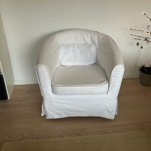Hvid IKEA Tullsta lænestol. Efterhånden nogle år gammel. Betrækket er vasket for nyligt.