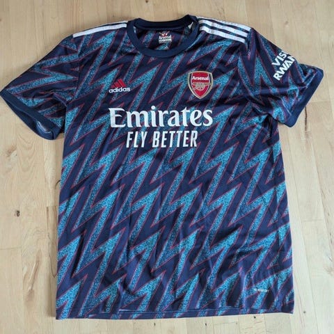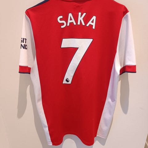 Adidas Arsenal fodboldtrøje til herrer i størrelse XL. Trøjen er i klassisk rød med hvide ærmer og hvide detaljer. På ryggen står navnet "Saka" og nummer 7. Foran har trøjen Arsenal-klubbens logo samt sponsortryk. Velegnet til fodbold og fritidsbrug.