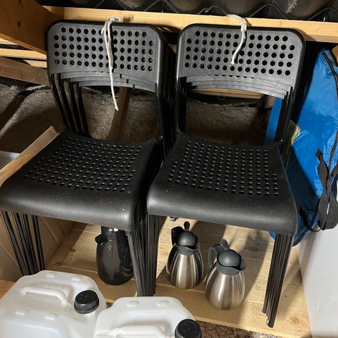 Meget komfortable stabelstole købt hos søs Grene for knapt 400,- pr stol. Yderst solide. Siddepuderne kan følge med. Der er 8 i alt. Samlet pris: 200,-