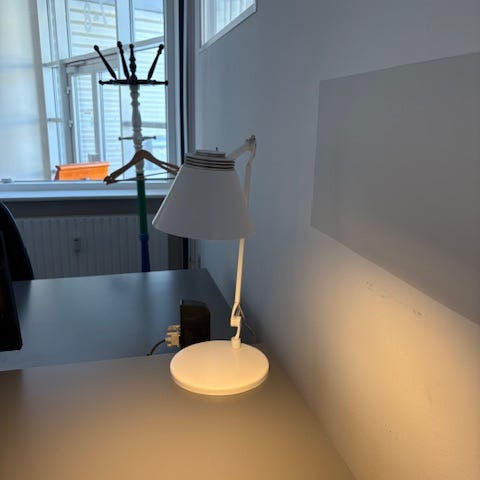 Bordlampe med hvid lampeskærm og rund metalfod. Lampen har ledning med stik og afbryder samt fatning til pære i skærmens midte.