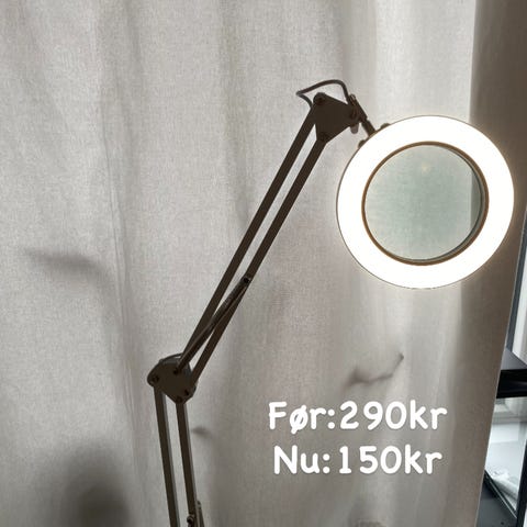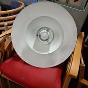 Lampen har en rund, gylden skærm med en central lyskilde. Den har en enkel ledning og kontakt.