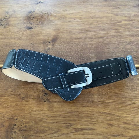 Damebælte i sølvfarvet materiale med metalnitter og spænde. Længde ca. 95 cm. Smalt design, egnet til brug i bukser, jeans eller over kjoler. Neutral stil, der kan kombineres med forskellige outfits.