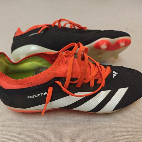 Adidas Predator fodboldstøvler i rød med hvide detaljer. Støvlerne er uden snørebånd med sok-lignende overdel. Ydersålen har faste knopper til brug på græsbaner, med Predator-logo under sålen. Størrelse EU 42 (US 8½, UK 8, FR 42⅔). Velegnet som fodboldstøvler til udendørs spil på naturgræs.