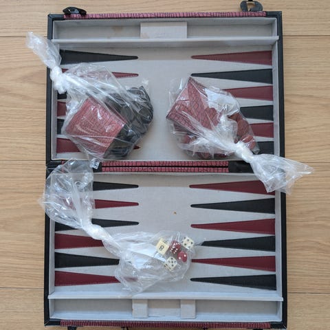 Backgammon træspil i kuffert. Spillepladen er integreret i en trææske med håndtag og metal-låse. Sættet indeholder spilleplade, brikker, terninger, raflebæger og vejledning. Velegnet som transportabelt brætspil til to spillere.