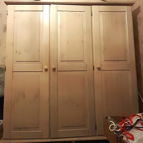Vi har bare ikke plads til den i vores nye bopæl. GRIB din chance! Men klædeskabet er lavet af tung og robust træ plader og de vejer meget. Man skal bringe enten en varevogn eller en lang trailer for at hente skabet. Kun 500kr