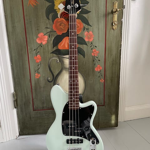 Ibanez Soundgear el-bas, 4-strenget model i rød finish. Basguitaren har to pickups, volumen- og tonekontroller samt bolt-on hals med gribebræt i mørkt træ. Medfølgende basforstærker med indbyggede tonekontroller og flere ind- og udgange, egnet til øvning og mindre sammenhænge. Sættet er velegnet til el-basbrug i forskellige genrer og spillesituationer.