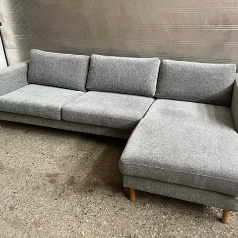 Raun sofa med chaiselong og puf. Sofaen er fra 2006 og derfor godt brugt med enkelte pletter. Siddekomforten fejler dog intet! Ideel til slyngelstuen, teenageværelset eller sommerhuset.