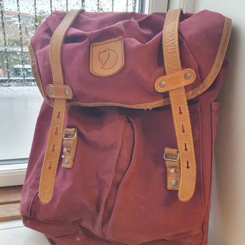 Fjällräven rygsæk i blå farve med læderdetaljer på stropper og kanter.