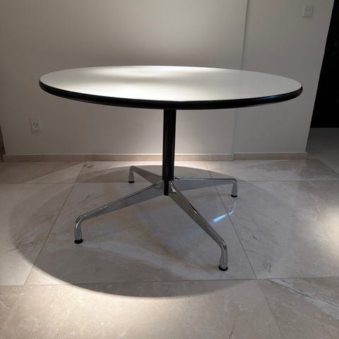 Round table 110cm diameter and 72cm height. Melamine with marble like finishing, steel durable structure. Durable and nice Scandinavian design.