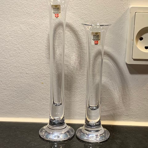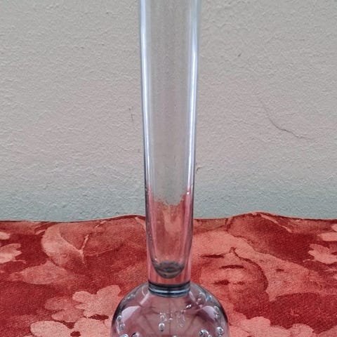 klart glas med kugleformet grålig fod med luftbobler, lang slank hals, designet til en enkel blomst f.eks Orkide, H: 24 cm, Dia. 3 cm, vægt 239 g, Per Lûtken, ikke signeret. Meget flot stand, sender gerne, dog ikke med fiks færdig, porto oveni