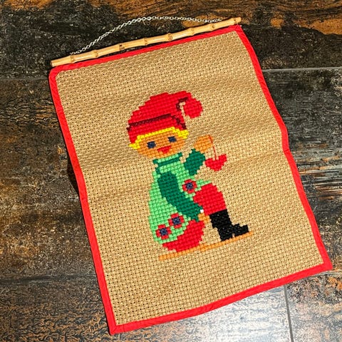 Stor flot Juleophæng, Jule ophæng til væggen. Skab hyggelig julestemning i stue og køkken. Fin broderet til væg med juledekoration, julelys hjerte julekugle, stjerne, klokke og Gran. Rigtig hyggelig lavet på noget der ligner sækkelærred.