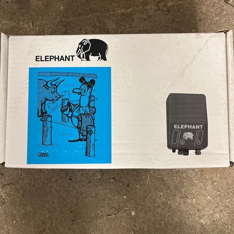 Elephant C1000-PE hegnsenergizer til elhegn. Enheden drives af 230V / 50Hz og er mærket IP34. Modelbetegnelsen er C1000-PE, og typeskiltet angiver overensstemmelse med relevante CE-standarder. Enheden er beregnet til tilslutning af hegnstråd og jordforbindelse via tilslutningsklemmerne i bunden. Velegnet som strømforsyning til elektriske hegn omkring fx marker eller indhegninger, hvor der er adgang til fast 230V strøm.