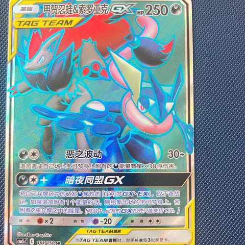 Pokémon Greninja GX samlekort. Motivet viser Pokémon-figuren Greninja i GX-udgave med illustreret holo/foil-overflade. Kortet er er Nm
