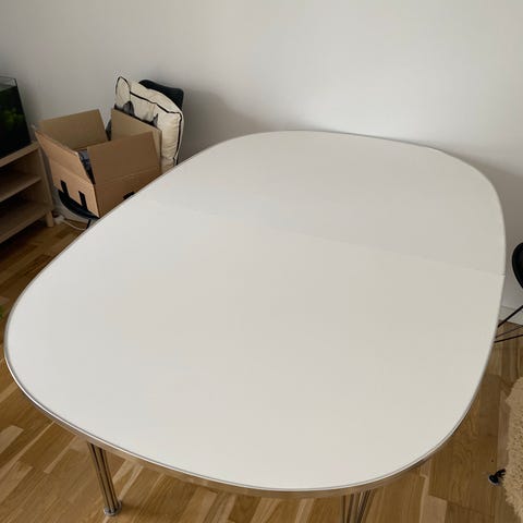 Hvid højglans spisebord med 2 indbyggede tillægsplader. Kan være 240 cm lang. Bordet fejler ingenting og er fuldt funktionelt.