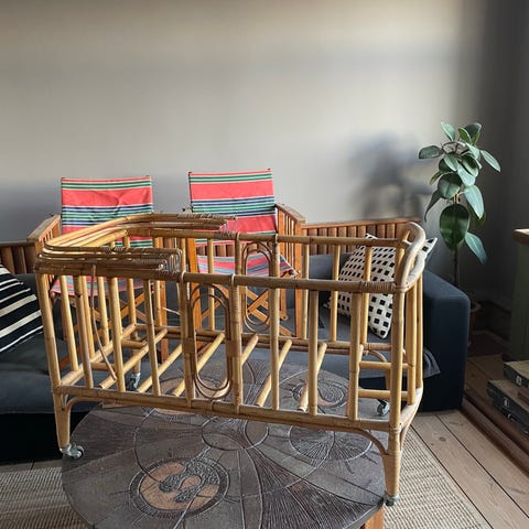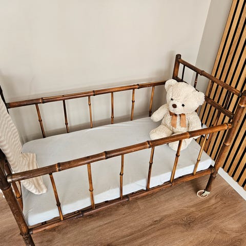 Fed baby/børneseng i bambus. Madras medfølger. Der er også sider og ender, som medfølger.