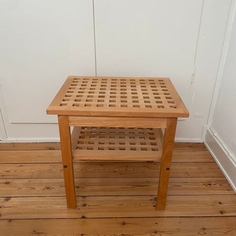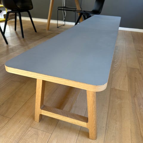 Aflangt møbel fra LLLP, Nicholas Rose. Kan bruges som bænk eller sofabord. Tyk birkekrydsfiner med hvid laminatoverflade. Brugt, men fin stand med mindre ridser/hak i laminaten, se billeder. 44 x 160 x 36 (HxDxL)