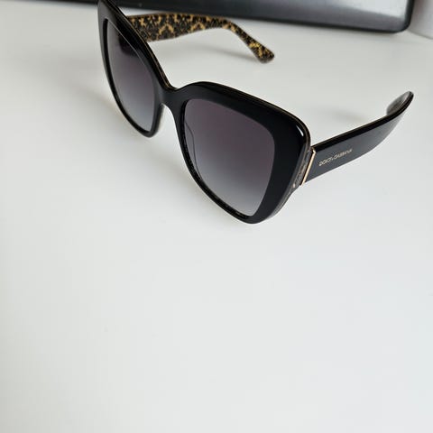 Dolce & Gabbana DG4450 solbriller. Disse cat eye-formede briller har et poleret hvidt acetatstel, der tilføjer et strejf af elegance til ethvert look. De solide mørkegrå glas giver ikke kun fremragende beskyttelse, men tilføjer også et sofistikeret touch til det overordnede design.