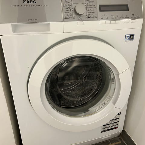 AEG vaskemaskine. Den har lækket lidt vand, så sælges til gratis afhentning og skal selv bæres ned fra 2 sal uden elevator.