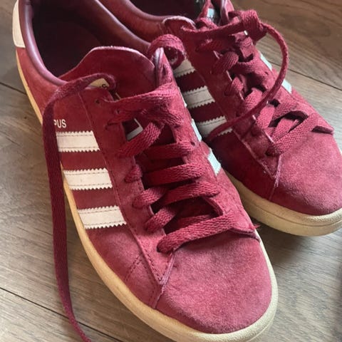 Adidas sneakers i str. 40. Skoene er røde med hvide striber og gummisål. Klassisk snørelukning og polstret pløs og hælkappe for bedre komfort. Velegnet som hverdagssko eller fritidssko.