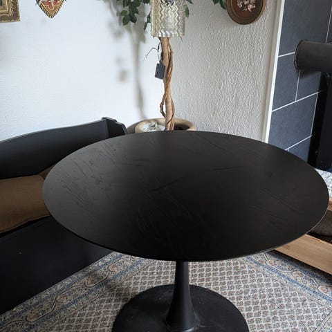 Sælger rundt RINGSTED spisebord Ø100 cm i sort askefiner inkl. 4 matchende stole. Bordet er købt hos JYSK for ca. 6 måneder siden og fremstår som nyt uden synlige skader eller større brugsspor. Perfekt størrelse til lejlighed eller mindre spiseområde.