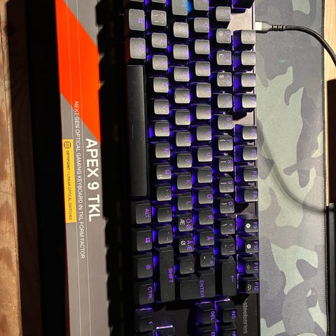 Apex 9 TKL er et kompakt gamingtastatur i tenkeyless-format uden numerisk tastatur. Det har mekaniske taster og RGB-belysning over hele tastaturet.