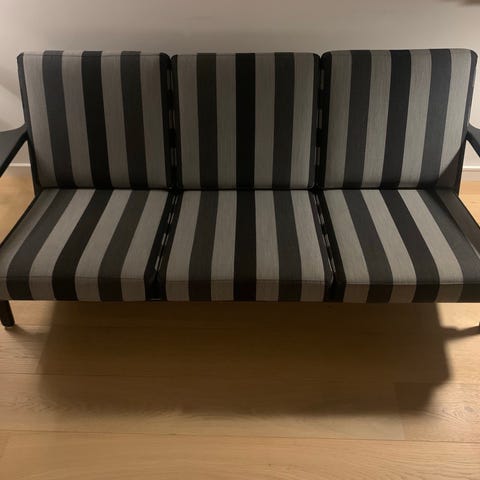 Smuk Hans J. Wegner trepersoners Ge236 sofa med egetræstel og løse hynder. Sofaen har et massivt træstel med lameller og fjedre under sædet. Stel opstrammet af snedker for nylig, ligesom betræk er i god stand.
