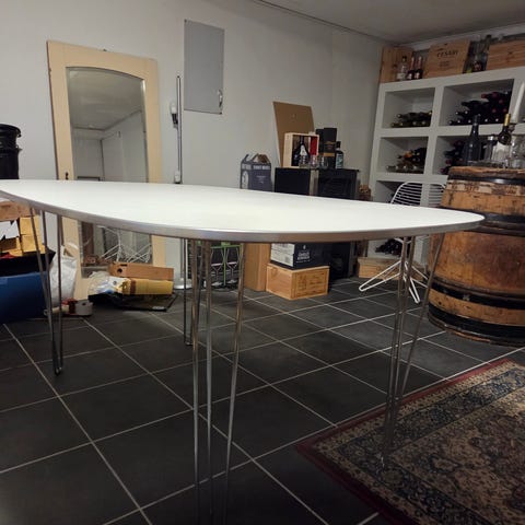 Gratis spisebord kan hentes i Næstved. Det har nogle skrammer på bordpladen, men fejler ikke andet. Benene kan skrues af. Ø105