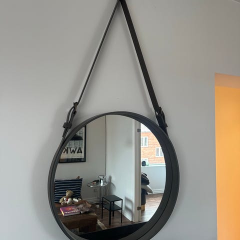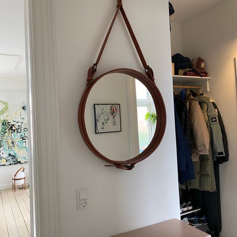 Originale ophæng og skruer medfølger. Vi har lavet et ekstra hul i remmen så den blev kortere og kunne hænge over vores vandhane.