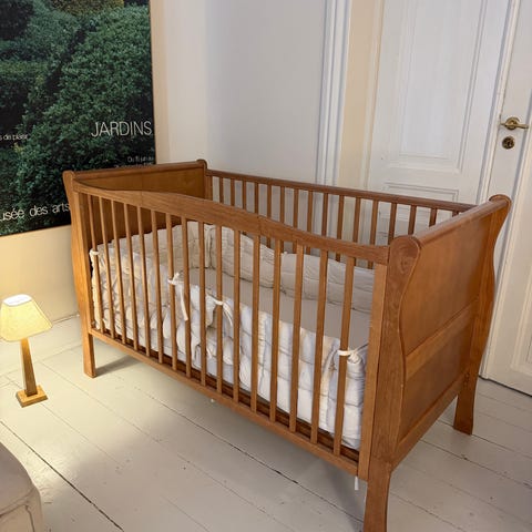 Lionelo Leonie Plus 3-i-1 tremmeseng med hjul, gyngefunktion og reb til at fastgøre den til forældrenes seng (inklusive kontinentalsenge). Købt i April 2025 (kvittering kan vises) og brugt kun 4 måneder.