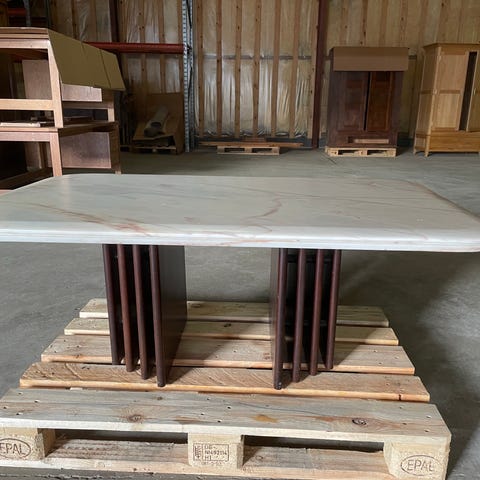 Bendixen Design, sofabord med stel af bejdset bøgetræ, cirkulær plade af marmor. 1970/80'erne. H. 48 Ø 100 cm. Fremstår i pæn stand med en enkelt skjold fra vase eller lignende.