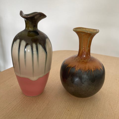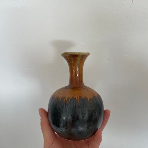Fin, lille vase fra Kina (står i bunden hvor, men jeg kan ikke tyde det) i blå og hvid porcelæn. Til et par enkelte mindre blomster.