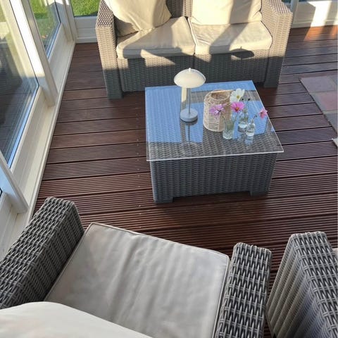 Den ene stol har børnene pillet i det flettet materiale ved armlænet.