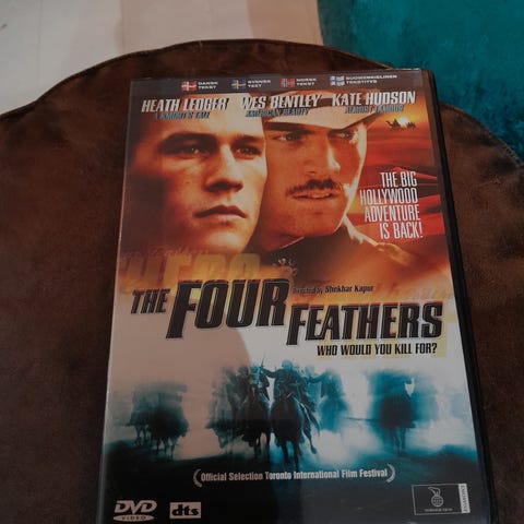 The Four Feathers dvd film. Dvd-udgave af spillefilmen The Four Feathers med blandt andre Heath Ledger og Wes Bentley. Forsiden viser originalt filmcover. Egnet til afspilning på dvd-afspillere, der understøtter regionen angivet på omslaget. Aldersgrænse 15 år ifølge mærkning på forsiden.