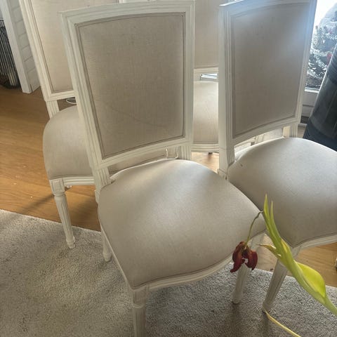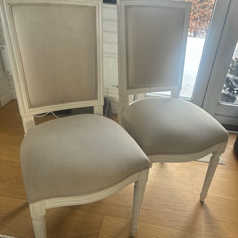 2 fine spisestole som mest har stået til pynt. Selve stolene fejler intet, men der er brugsspor på betrækket.