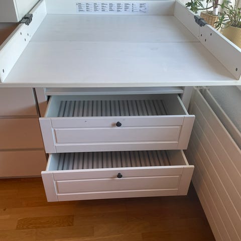 Kan bruges som puslebord og efterfølgende laves om til almindelig kommode – super praktisk løsning.