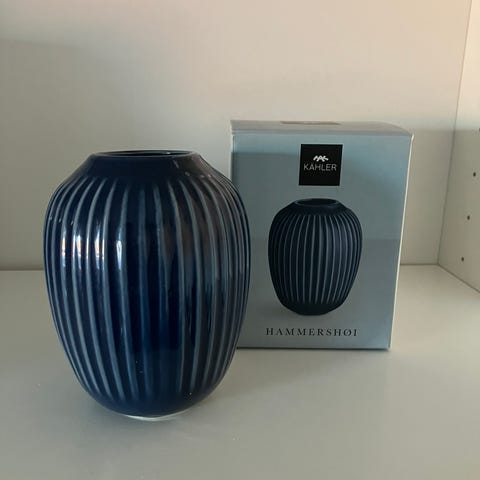 Kahler, mini Vase Kahler i hvid porcelæn med petrol /lysegrønt striber . str. H. 8 cm. ny, kan hentes 25 kr. per stk. sendes gerne privat