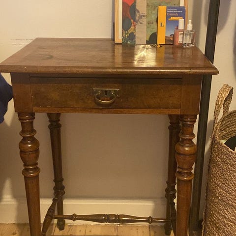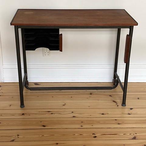 Fint lille skrivebord til det lille værelse. Bordet er i gråt metalstel med indstillelige fødder (tror det er et gammelt skolebord så det kan være i almindelig voksenhøjde men også skrues ned til noget som passer børn bedre). Pladen er fineret træ (måske teak) og bærer præg af slid, både ridser og lidt vandmærke lignende, (se billeder) Hurtig afhentning prioriteres.