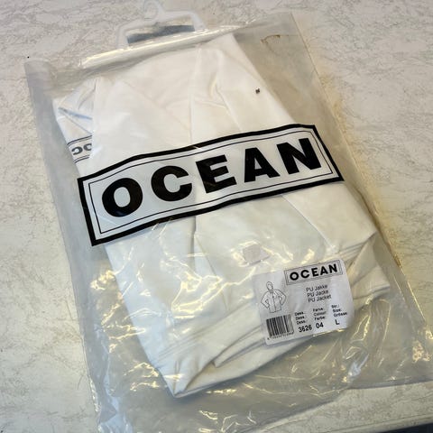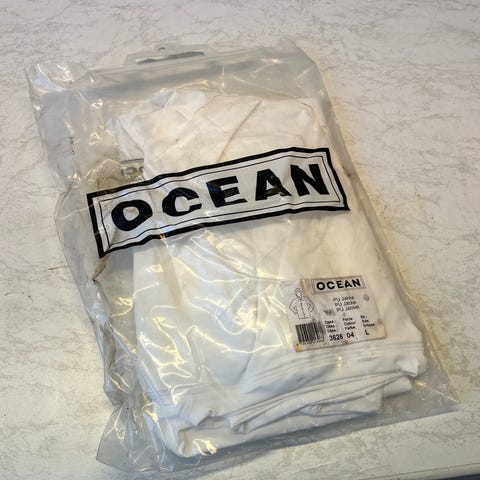 Ocean PU jakke i hvid, størrelse L. Jakken er fremstillet i PU-materiale (polyurethan), som er vandafvisende og egner sig til brug i vådt eller snavset miljø. Modellen har hætte. Velegnet som arbejds- eller regnjakke, hvor der ønskes ekstra beskyttelse mod vind og fugt.