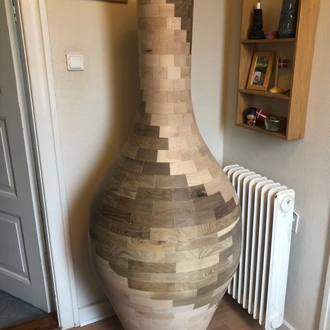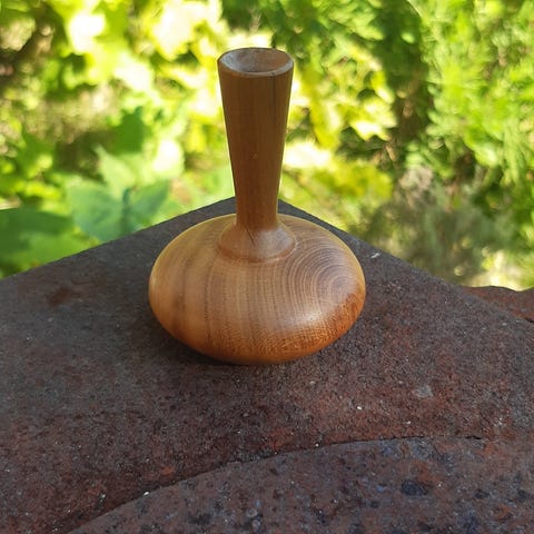 Svæve vase - håndlavet af drejet træ - med vanilieglasrør som blomster holder i midten af pladen - 3 slanke ben med toppe på oversiden