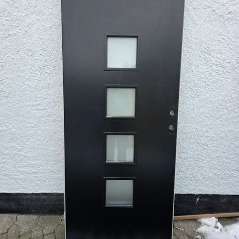 Yderdør med glasfelter i hvid farve. Døren har øverste del med fire ruder og nederste del med fyldninger. Ifølge mærkaten er de udvendige mål ca. 976mm i bredden og 1890mm i højden. Velegnet som yderdør til bolig, udhus eller lignende, hvor der ønskes lysindfald gennem glasfelterne.