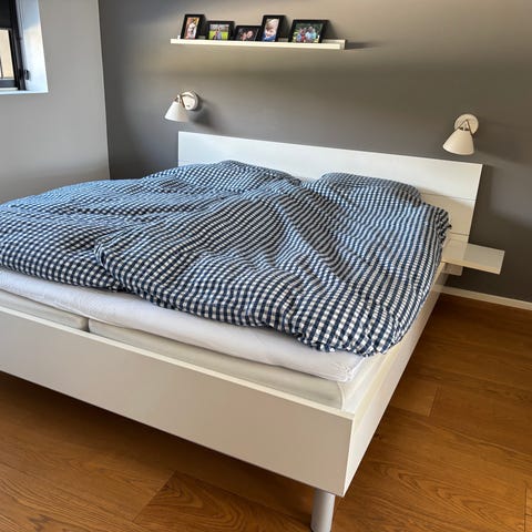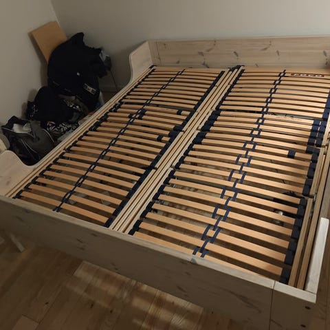 Sengeramme i valnød med stærke lameller og metalben i mat sort sælges for 1200 kr. Passer til to madrasser i 90x200 eller en 180x200 cm.