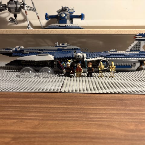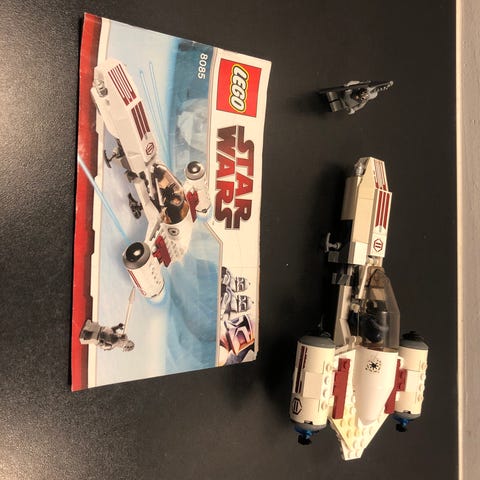 LEGO Star Wars The Phantom rumskib. Sættet omfatter et mindre rumskib med cockpit og bagklap samt flere minifigurer og en droide. Der medfølger også en byggevejledning med illustrationer af modellen og dens funktioner. Velegnet til leg og opbygning af scener fra Star Wars-universet.