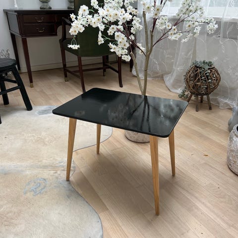 Kvadratisk sort skiferbord. Bordet har en enkel, slank ramme med fire lige ben og en plan bordplade. Velegnet som sofabord, sidebord eller lille spise- eller arbejdsbord i stue, kontor eller andre rum, hvor der er behov for et kompakt bord med neutral, enkel stil.