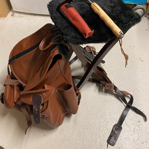Peak Tour rygsækstol i grøn nylon med integreret metalskelet og klapstol. Rygsækken har polstret sæde, bærestropper og flere lommer med spænder til opbevaring af udstyr. Egnet til brug på ture, jagt, fiskeri eller andre udendørsaktiviteter, hvor der er behov for både opbevaring og siddeplads.