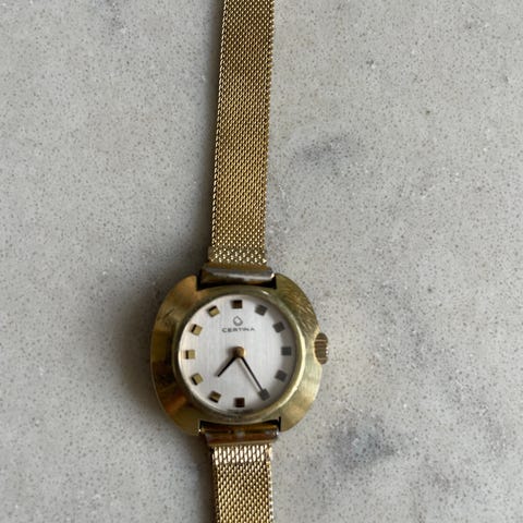 Certina dameur med guldfarvet urkasse og sort læderrem